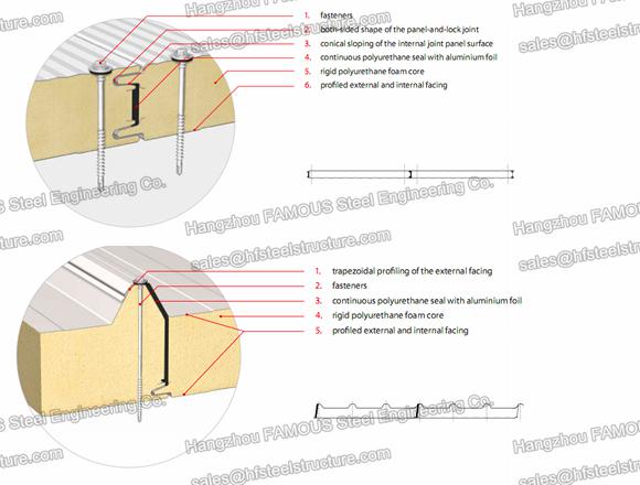 1. Heat and sound insulation:The outer steel sheets can maintain the lasting of the color of the building, and reduce the solar radiation and keep the appropriate indoor temperature. The high quality heat insulation materials are made with the adoption of polyurethane PU and (PIR) polyunsaturate resin acid hydrogen containing no Chlorofluorocarbon (CFC).